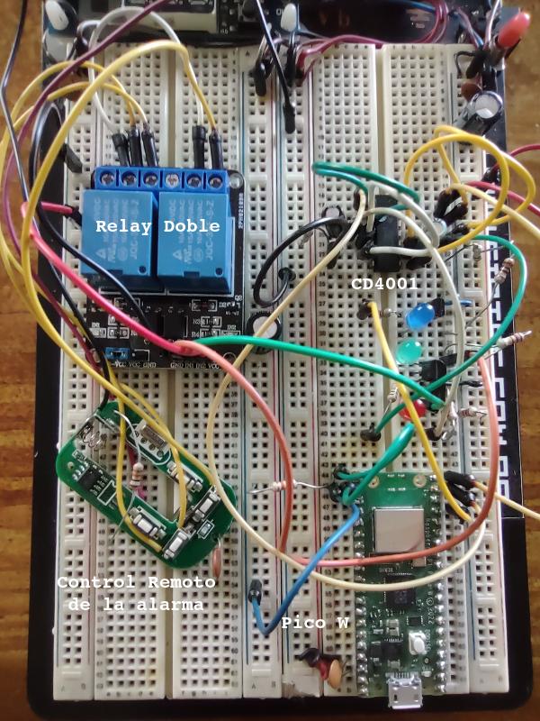 Se me ocurrió montarla en un deposito que está a varias calles de mi casa pero claro lo ideal seria poder controlar su estado y saber si se dispara o no. Como la alarma no tiene conectividad pero el deposito tiene conexión a Internet entonces me propuse construir un dispositivo que fuera capaz de actuar sobre los botones del control remoto y para eso desmonte uno de los controles dejando su placa al descubierto. Inicialmente arme todo en un proto-board para verificar su funcionamiento.